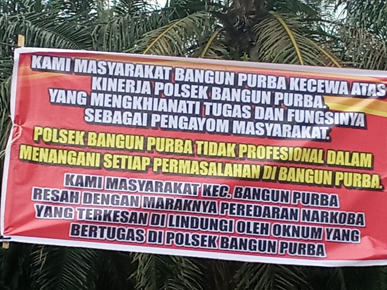 “Kami masyarakat Bangun Purba kecewa atas kinerja Polsek Bangun Purba yang menghianati tugas dan fungsinya sebagai pengayom masyarakat. POLSEK BANGUN PURBA TIDAK PROFESIONAL DALAM MENANGANI SETIAP PERMASALAHAN DI BANGUN PURBA. Kami resah dengan maraknya peredaran narkoba yang terkesan dilindungi oleh oknum Polsek,” demikian isi pernyataan dalam spanduk tersebut.